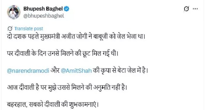 रायपुर : दिवाली पर चैतन्य बघेल से मिलने आज भूपेश बघेल को अनुमति नहीं मिली। उन्होंने X पोस्ट में बताया, दो दशक पहले मुख्यमंत्री अजीत जोगी ने बाबूजी को जेल भेजा था। पर दीवाली के दिन उनसे मिलने की छूट मिल गई थी।