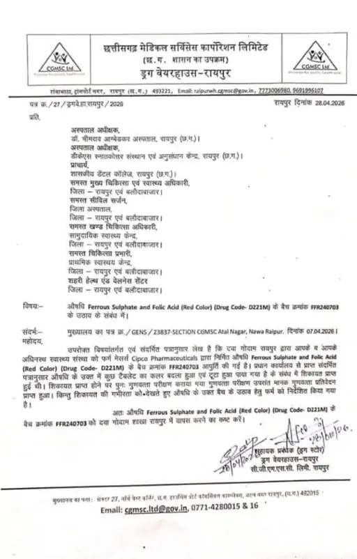 छत्तीसगढ़ मेडिकल सर्विसेस कॉर्पोरेशन (CGMSC) ने आयरन-फोलिक एसिड की एक दवा बैच को वापस मंगाने के निर्देश जारी किए हैं। यह आदेश रायपुर और बलौदाबाजार जिले के अस्पतालों, जिला अस्पतालों, सामुदायिक स्वास्थ्य केंद्रों, प्राथमिक स्वास्थ्य केंद्रों और शहरी हेल्थ एंड वेलनेस सेंटरों को जारी किया गया है।