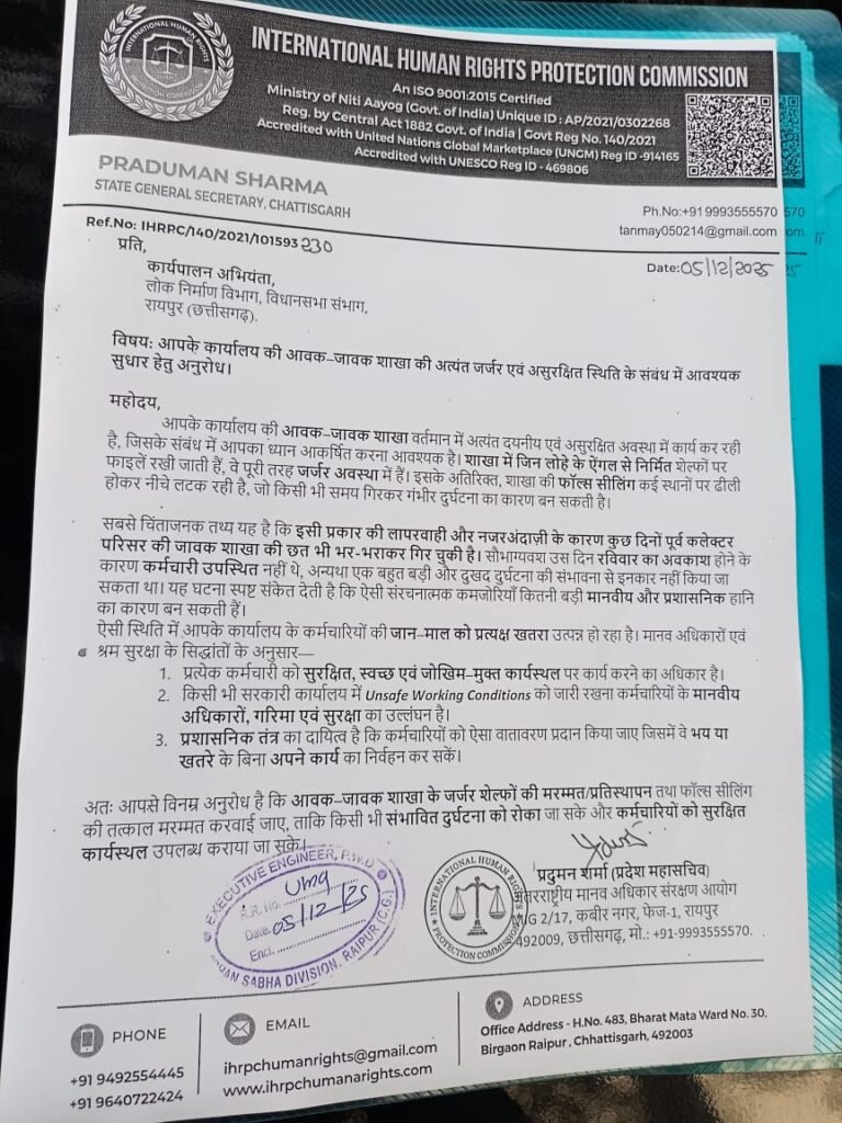 रायपुर : PWD विधानसभा संभाग, रायपुर स्थित आवक–जावक शाखा की अत्यंत जर्जर एवं असुरक्षित स्थिति को लेकर अंतरराष्ट्रीय मानव अधिकार संरक्षण आयोग (IHRPC) के प्रदेश महासचिव श्री प्रदुमन शर्मा ने गंभीर चिंता व्यक्त करते हुए विभाग को तत्काल सुधारात्मक कार्रवाई के लिए विभाग को आग्रह पत्र जारी किया है।
