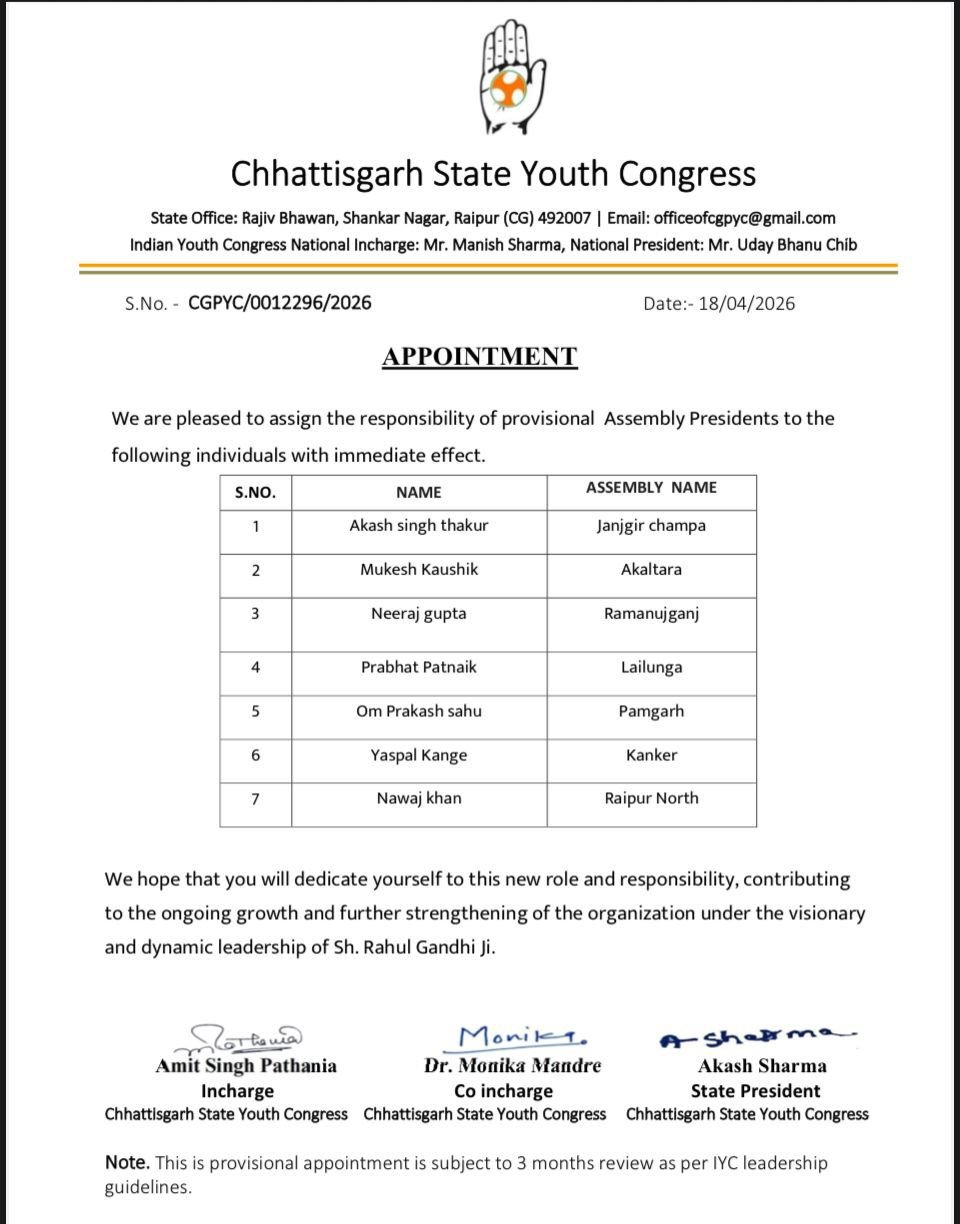 उनके कार्यों और संगठन के प्रति निष्ठा को देखते हुए छत्तीसगढ़ प्रदेश युवा कांग्रेस के प्रदेश अध्यक्ष आकाश शर्मा, प्रभारी अमित सिंह पठानिया एवं सह-प्रभारी डॉ. मोनिका मंदरे ने आज दिनांक 18/04/2026 को पत्र क्रमांक CGPYC/0012296/2026 के माध्यम से उन्हें पूर्ण रूप से रायपुर उत्तर विधानसभा युवा कांग्रेस का अध्यक्ष नियुक्त किया है।