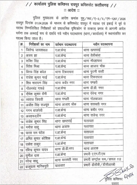 पुलिस कमिश्नरेट द्वारा आदेश जारी कर नई पदस्थापनाओं की सूची जारी की गई है।