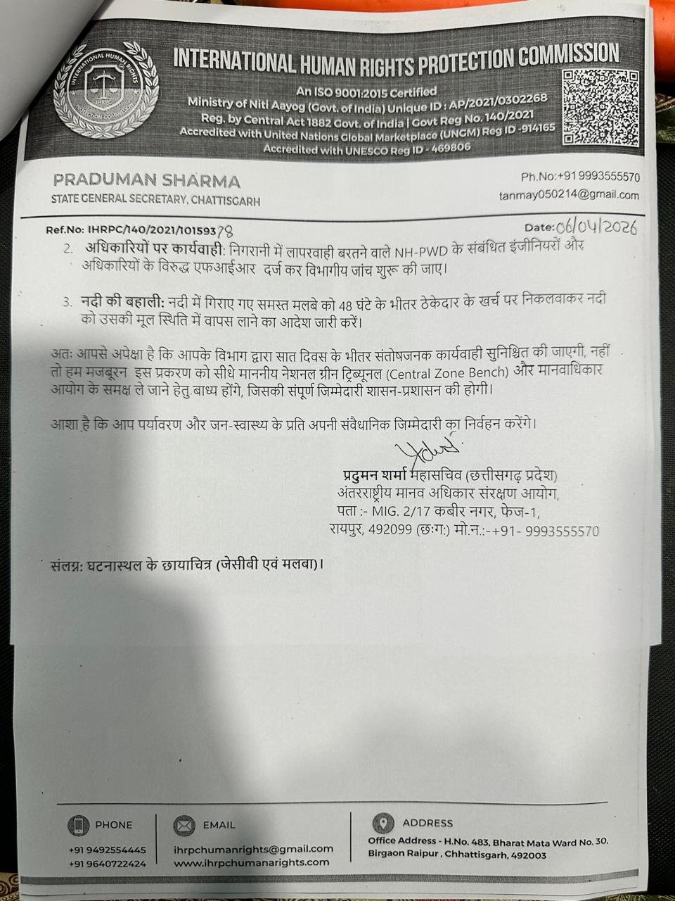 भविष्यगामी विधिक कदम: प्रदेश महासचिव प्रदुमन शर्मा ने प्रशासन को अवगत कराया है कि, “पर्यावरण संरक्षण के प्रति अपनी संवैधानिक जिम्मेदारी का निर्वहन करते हुए, यदि निर्धारित सात दिनों की अवधि में शासन द्वारा संतोषजनक कार्यवाही सुनिश्चित नहीं की जाती है, तो आयोग इस जनहित के मुद्दे को नेशनल ग्रीन ट्रिब्यूनल एवं मानवाधिकार आयोग के समक्ष आधिकारिक रूप से प्रस्तुत करने हेतु बाध्य होगा। इसकी संपूर्ण उत्तरदायित्व संबंधित विभाग एवं प्रशासन की होगी।”