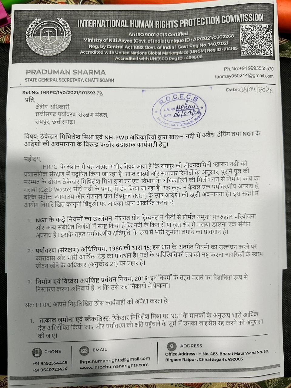 रायपुर। राजधानी की जीवनदायिनी खारुन नदी को प्रदूषण से बचाने और पर्यावरणीय नियमों के उल्लंघन को रोकने के लिए अंतरराष्ट्रीय मानवाधिकार संरक्षण आयोग ने कड़ा रुख अपनाया है। IHRPC के प्रदेश महासचिव प्रदुमन शर्मा ने छत्तीसगढ़ पर्यावरण संरक्षण मंडल के क्षेत्रीय अधिकारी को पत्र सौंपकर खारुन नदी में निर्माण सामग्री और मलबे की अवैध डंपिंग के विरुद्ध कठोर दंडात्मक कार्रवाई की मांग की है।